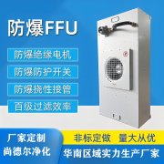 深圳市尚德尔净化设备有限公司是防爆FFU净化单元生产厂商。防爆FFU,是一种自带动力具有过滤功能的末端送风装置;风机从顶部将空气吸 入并经HEPA过滤,过滤后将洁净空气从出风面均匀送出,为洁净环境提供洁净空气和微粒过滤控制。 各种FFU最多由以下几部分组成(按从上到下、从内到外的顺序),视不同厂家组成部分可能有所减少。 1、预过滤器;2、外壳体;3、防爆接线管;4、防爆电机5、叶轮;6、防爆接线盒;7、过滤器;8、金 属防护网;9、刀缘;10、控制元件 分体形状的FFU有如下优势:① 使过滤器的更换变得方便;② 减小了安装过程中的劳动强度; 整体形状的 防爆FFU有如下优势:① 增加了FFU的密封性,有效防止了泄漏。② 有利于降低噪音。③ 有利于减小振动